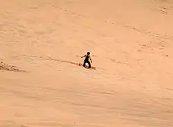 Also the desert has many different activities, one local specialty being sandboarding, also known as duneboarding. You can ski the dunes just like you're snowboarding, or ride the board on your belly. Extremely high speeds — not for the faint hearted. This activity can be performed either on the world's highest sand dunes near Walvis Bay or some smaller dunes near Swakopmund. Alter Action has access to the infamous "Dizzy" hill. Tight clothing, sport shoes, sunglasses and sunblock are needed to take part in this activity. Beware that sand may damage your camera; though usually the price includes the operator taking video and photos of you performing the activity and giving you the footage.