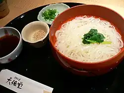 - Zaru udon - (Cold) Cold noodles come on a wooden tray. From there, you pick them up, dip them into a soy-based broth that comes with the dish, and then eat.