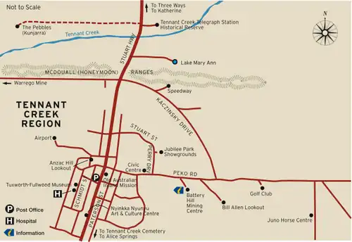 - 🌍 Tennant Creek Museum at Tuxworth Fullwood House, Schmidt St, ☏ +61 8 8981 2848. Built by the Army in 1942 as No. 45 Australian Camp Hospital, the building now features a wide range of exhibits, including a 1930s police cell and steam traction engine. It also houses a reconstruction of a miner's camp and mine workings, a Furphy water cart, an extensive archive and early photographs of the town and its people. Entry fees apply.
