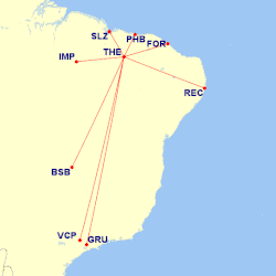 - 🌍 Teresina Airport/Senador Petrônio Portella (THE IATA), Praça Santos Dumont, s/n - Bairro Aeroporto (in the northwestern region of the city off of Avenida Centenário), ☏ +55 86 3133-6270. Served by Gol, LATAM, Azul airlines, and two very small regional carriers called Sete and Piquiatuba. Similar to other smaller destinations in northern and northeastern Brazil, fares in and out of Teresina are much more expensive than central and southern Brazil. Plan ahead when booking. Last minute fares through Teresina are extremely expensive.