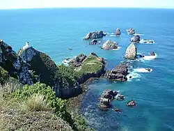 - 🌍 Nugget Point, The Nuggets Rd (south of Kaka Point). A spectacular sea scene with a lighthouse (built 1869–70) and the Nuggets (a group of rocky islets), which can be viewed from the lighthouse (a 10–20 min return walk from the end carpark). If you look down from the walk, well below near sea level are breeding colonies of royal spoonbill birds and fur seals. Sea lions come here, and sometimes elephant seals in summer. Roaring Bay (20 min return) can be accessed from a carpark before the main one. Yellow-eyed penguins come ashore in the bay in the late afternoon. There is a hide from which you can view them – avoid going on to the beach in the late afternoon. There is a picnic area and toilets near the end carpark.