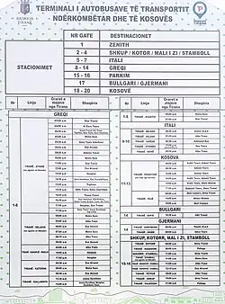 Platform Destination Times 1 Elbasan (different companies) 05:45–19:45 (hourly), 09:30, 12:30, 16:00, 20:00 & 06:00, 06:30, 07:00, 07:30, 08:00, 08:30, 08:45, 09:00, 13:00, 13:30, 14:00, 14:15, 14:30, 15:00, 15:15, 15:30, 16:00, 19:45, 20:00, 20:30, 21:00, 21:30 1 Belsh 13:00 1 Cërrik 13:00 1 Gramsh 07:00, 09:00, 13:00, 15:00 2 Librazhd 12:15, 14:00, 16:00 3 Përrenjas 13:00, 14:00 4 Pogradec 06:30, 08:30, 09:30, 12:30, 13:30, 14:30, 15:30 5 Korçë 05:45, 06:30, 07:15, 08:00, 08:45, 09:30, 10:15, 11:00, 11:45, 12:30, 13:15, 14:00, 14:45, 15:30, 16:15, 17:00 5 Ersekë 06:00, 10:00, 14:30 5 Leskovik 13:00 6 Bilisht 06:30, 07:00, 11:30, 14:30