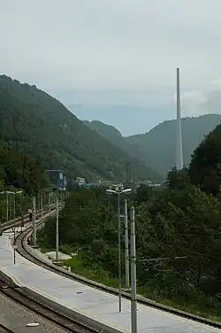 - 🌍 Trbovlje Chimney (Trboveljski dimnik) (2 km east of the station). Trbovlje's main claim to statistical fame, at 360 m this is the tallest chimney in Europe (for comparison, the Eiffel Tower is 300 m). Operated by Trbovlje's coal-fired power plant, it serves to disperse the plant's pollution over a wider area and to make sure the flue gasses are evacuated from the narrow deep valley under all weather conditions. Since 2014 the plant has been put on reserve to meet carbon emission goals, and the chimney has been fitted as the tallest man-made bouldering wall in the world. The difficulty level is extreme however so few can handle the challenge, but even just watching the climbers is a view to behold.