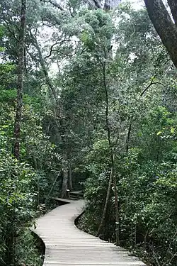 The Tsitsikamma forms part of the Cacadu District of the Eastern Cape and is branded as one of the Cacadu District's seven wonders due to its beauty. Tsitsikamma is a Khoi word meaning "place of abundant or sparkling water". The area is covered in large tracts of indigenous forest and Fynbos with deep river gorges that cleft the plateau as they make their way down to the sea, creating spectacular waterfalls and deep kloofs.