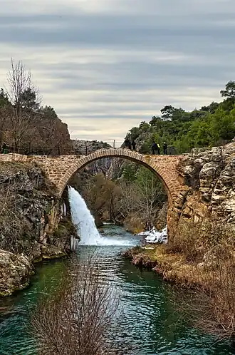 - 🌍 Cılandras Bridge 38 km south of Uşak was an aqueduct built by the Phrygians about 500 BC to supply the town of Pepuza. It's a single 24 m arch across the ravine of the Banaz creek, and you can walk over but there's no onward path. The waterfall adjacent is artificial, the discharge sluice of a hydroelectric power plant. The site is free 24 hours and a popular picnic area.
