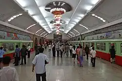 Similar to Soviet systems, it has a dual utility as a bomb shelter, with thick steel blast doors at every entrance. Gaping hallways with massive chandeliers will greet you, as will Socialist Realist art depicted in murals such as "The Great Leader Kim Il Sung Among Workers".