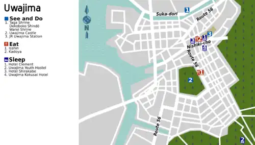 - Tourist Information, 3-24 Nishiki-cho, ☏ +81 895-22-3934. Daily 08:30-17:00. Across the street from the train station, with a range of English handouts. Bike rentals are available for ¥100/hour.
