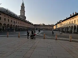 Piazza Ducale. h24. The Piazza Ducale of Vigevano is a large Renaissance-style square. Its construction began in 1492 at the behest of Ludovico il Moro as an antechamber of the castle and was completed in 1494. It is a rectangular square that winds under the arcades on three sides and which sees the fourth side occupied by the Cathedral of Vigevano. It should be noted that above each arch of the arcades there are medallions depicting historical figures of the Renaissance period with some mottos that distinguish them. The beating heart of the city, it is connected by a staircase to the Vigevano Castle and the Bramante Tower which overlooks the roofs of the center and which remains, still today, the tallest building in the city. 134 m long and 48 m wide, it is built on three sides (the fourth is occupied by the Cathedral Church of Sant'Ambrogio) with homogeneous buildings with uniform façades and arcades surrounding a forum that follows the Roman model described by Vitruvius. The area had been characterised by a wide road surrounded by buildings mostly arcaded, including that of the municipality. As a result of the fourteenth-century expansion, it developed north of the fortified promontory of the ancient village which disappeared with the Visconti and Sforza transformations that led to the construction of the current "castle". The village and the primitive adjoining castle, located in an elevated position, was accessed by means of a ramp or perhaps a staircase placed in correspondence with the current tower which serves as the entrance to the castle. The new square was built under the direction of the ducal engineer Ambrogio da Corte with the demolition of the houses located towards the escarpment on which the castle stands and the reuse of the buildings to the north and west, aligning them with the reconstruction of the facades. The Sforza construction had the south side interrupted, in correspondence with the tower, by a wide connecting ramp between the square and the castle; the west side extended up to the escarpment of the castle (some arches with the original columns are inserted in the Commercio café) and was divided into two parts joined by a triumphal arch at the entrance to via del Popolo, while on the north side, in correspondence of the connection with the west one, just in front of the ramp, there was a triumphal arch with three arches corresponding to the entrance to via Giorgio Silva. The facades were totally decorated with frescoes very similar to the contemporary paintings of Palazzo Bottigella in Pavia. The current form is the result of the intervention of 1680, carried out by bishop Juan Caramuel y Lobkowitz, in which the ramp is demolished and a staircase is built, inserted in the completion of the missing section of the south side, part of the west side (towards the castle) is incorporated in the southern body. The layout of the square was definitively modified by Caramuel with the construction of the new facade of the cathedral: a concave facade, leaning against the church like a theatrical backdrop, which embraces and welcomes the enclosure of the square, overturning the Sforza square-castle relationship, transforming it into a square. church. In an unknown period, perhaps in the mid-18th century, the triumphal arches were replaced, completing the rhythm of the arches, with new columns of material and construction different from those of the 15th century. In the first half of the eighteenth century the Austrian occupiers placed a statue of St. John of Nepomuk, which still characterizes the western side of the square today. The pavement with pebbles and serizzo slabs dates back to the mid-nineteenth century, when the pavement of the arcades, originally in herringbone bricks, was also replaced with the current one. In 1911, by the architect Moretti, the design was made with white pebbles and the street lamps were inserted. Between 1905 and 1910 an extensive restoration was carried out which brought to light the fragments of the Sforza frescoes, hidden by the eighteenth-century paintings, by the Vigevanese painters Casimiro Ottone and Luigi Bocca, which integrates the fragments with a new pictorial decoration in Renaissance style; during the works the roofs are redone with the construction of the eclectic fireplaces and the current lampposts are installed. On the occasion of the 500th anniversary of its construction, between 1992 and 1996, the repainting of the decoration of the beginning of the century is carried out and the restoration of what remains of the original Sforza frescoes. The square is a meeting and meeting place, certainly the favourite of the Vigevanese people, and the main point of reference for tourists. It houses various shops and also the stop of the tourist train of the city. Gratis.