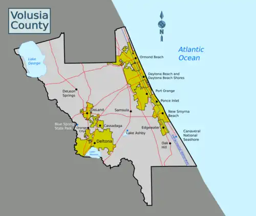 - 🌍 Daytona Beach — the business and tourism capital of the county, it's famous for speedway and baseball player Jackie Robinson, and is the location of Volusia County's main airport, with regular flights from DAB IATA to the Delta hub in Atlanta.