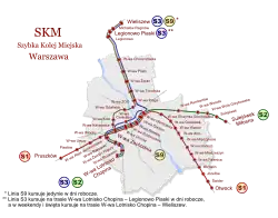 By train: Lotnisko Chopina station is next to Arrivals. Szybka Kolej Miejska (SKM) train Line S2 runs downtown every 30 min, taking 25 min via Służewiec, Zachodnia (West) station, Śródmieście station (for Centralna bus and railway stations), Stadion, Wschodnia (East) station and Sulejówek. It runs to the city 06:00-23:30 and outward 05:00-23:30. Line S3 runs downtown hourly through Warszawa Zachodnia (West), Warszawa Centralna and Warszawa Wschodnia (East) to Legionowo Piaski / Radzymin.