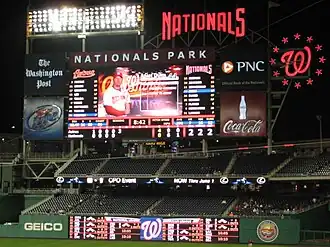 - π Nationals Park, 1500 South Capitol St SE. Nationals Park opened in 2008, and is home of the Washington Nationals baseball team, The Nats. The Nationals, though, have history beyond its 2005 revival β D.C.'s first baseball franchise from 1891-99 bore the same (interchangeably with the Washington Senators), as did its two other successors throughout the 20th century. None were very successful though. The first disbanded after nine years with a 0.366 win percentage; the second and third eventually left the city to become the Minnesota Twins and the Texas Rangers. After the Montreal Expos moved to the city, they followed in the D.C. tradition, and performed progressively worse with each passing year. In 2010, when the team finally started turning itself around, and acquired bona fide superstars in pitcher Stephen Strasburg, followed by outfielder Bryce Harper and pitcher Max Scherzer. The stadium is big, with comfy seats, an enormous scoreboard, and great concessions by venerable D.C. food establishments such as Five Guys, Ben's Chili Bowl, Dogfish Head, and Flying Dog Brewery. $20-250.