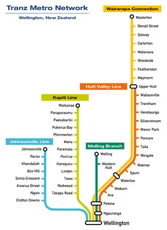 Metlink's suburban rail network provides frequent electric trains connecting central Wellington with the northern suburbs of Wellington City, Porirua, Lower Hutt, Upper Hutt and the Kapiti Coast. On weekdays, services run every 20 minutes on the Hutt Valley and Kapiti lines, every 30 minutes on the Johnsonville line, and hourly on the Melling line. On weekends, the service on the Hutt Valley and Kapiti lines reduces to every 30 minutes and there are no services on the Melling line. Metlink also operates a diesel train service to Masterton in the Wairarapa several times daily.