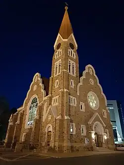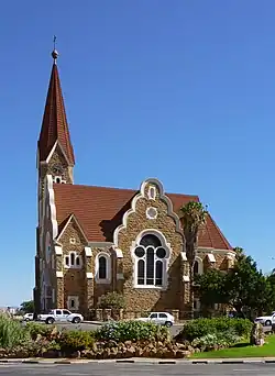 - ๐ Christuskirche, In the middle of a big traffic circle where Robert Mugabe Ave. and Fidel Castro St. meet, at the gates of the Parliamentary compound. The old Lutheran church. The circular stained-glass window in the facade and all the other stained-glass windows in the church were donated by Kaiser Wilhelm II, as a gift to the colony. In the 1990s, a tourist noticed that all the windows were installed with the sun protection on the inside, prompting authorities to re-install all of the windows properly.