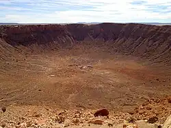 - 🌍 Meteor Crater (Exit 233 about 18 miles west of Winslow on I-40), ☏ +1 928-289-5898. Memorial Day - Sep 15: daily 7AM-7PM; Sep 16 - Memorial Day: daily 8AM-5PM. This is an exceptionally well preserved meteor (impact) crater, although not the largest in the world as sometimes claimed. The crater was formed approximately 50,000 years ago by an explosion estimated to be the equivalent of 2.5 megatons of TNT, or 150 times the force of the atomic bomb that destroyed Hiroshima. The meteorite itself was estimated to be 150 feet across and weighed approximately 300,000 tons. Although most of the meteorite itself vaporized upon impact, large chunks of nickel-iron remnants have been found in the surrounding area. It is historically important, as this was the site that informed much of the early theoretical work on the nature of meteorite impacts. Apollo astronauts trained here due to its similarity to lunar topography. The site is privately owned and includes a well-done visitor center with a number of interpretive exhibits and an on-site restaurant called Blasted Bistro. There short trails to viewpoints as well as a guided tour that goes around the rim. $16 (adults), $15 (seniors), $8 (juniors 8-17); no passes accepted.