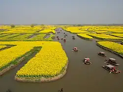 - 🌍 Qianduo Scenic Area (千垛景区, also Qiandao 兴化千岛菜花风景区). A huge area of rapeflower (canola) fields north of town, accessed primarily by canals. Trails and two lookout towers have been added for tourists, and boats take visitors on several standard routes. The rapeflowers bloom from late March through April, and a flower festival is held at this time, with the dates varying based on weather conditions. During the festival, a shuttle bus is available from the major bus terminals in Taizhou and Xinghua, including the bus terminal adjacent to Taizhou's high-speed rail station. The ¥99 return shuttle ticket includes the ¥99 admission to the scenic area and a boat ride. As of spring 2018 the area is relatively developed as a tourist attraction, with more trails and boat routes under construction (along with a shopping plaza at the entrance), but there is basically zero English information on it available anywhere, in any form, and foreigners do not seem to be a common sight. A basic grasp of the language can be extremely useful for buying shuttle bus tickets or finding the bus at the end of the day. ¥99.