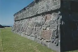 Structures at Xochicalco reflect Mayan design elements with many of the buildings being decorated with sculptured relief panels. The carvings appear sharp and well-defined with the Temple of the Feathered Serpent depicting Mayan gods and the upper levels of the pyramid depicting vassal communities paying tribute to Xochicalco.